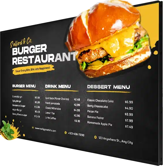 Traitement antireflet. Nos écrans menu board utilisent un panneau LCD et un rétroéclairage LED leur permettant une utilisation en continu 24/7 pour une durée de vie allant jusqu’à plus de 50.000 h d’utilisation sans interruption.